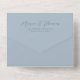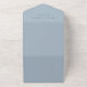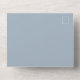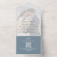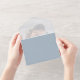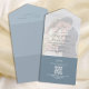 This design features a simple minimalist modern elegant dusty blue, with a QR code rsvp online website, a vellum photo picture overlay style, an elegant dusty blue romantic colours, a stylish trendy calligraphy script font, a modern guest response reply online, a tri-fold wedding invitation template, an elegant seal and send design, a photo wedding invitation template, a simplistic solid colour white text