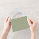 This design features a simple minimalist modern elegant sage green, with a QR code rsvp online website, a vellum photo picture overlay style, spring or summer or anytime romantic colours, a stylish trendy calligraphy script font, a modern guest response reply online, a tri-fold wedding invitation template, an elegant seal and send design, a photo wedding invitation template, a simplistic solid colour grey text