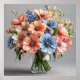 A stunning floral arrangement featuring pink, blue, and peach flowers displayed beautifully in a clear vase, perfect for decoration, weddings, and creating a calming atmosphere.