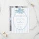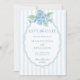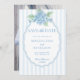 A vintage-inspired, classic, and elegant cottage grandmillennial design featuring a Victorian English garden aesthetic. Delicate watercolor blue hydrangeas and charming forget-me-not flowers are arranged against soft blue preppy stripes with a scalloped hand-drawn oval frame.
