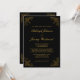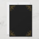 This elegant vintage-inspired formal wedding invitation features the text in gold coloured script and serif fonts, framed by ornate decorative gold motifs in all four corners, on a black background. The corner motifs are repeated on the reverse.