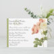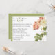 Lovely custom wedding invitation done in white, with a beautiful vintage illustration of pale pink and ivory roses, on the right side, of the invitation. A pale green band decorates the left side of the invitation and on the back is solid light green. Text, in black script, is fully customisable to suit your wedding needs. Matching products available.