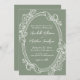 Sage Green Filigree Frame Wedding Invitation. Add a touch of timeless elegance to your wedding with this refined and romantic design. The invitation features a soft sage green background on both sides, paired with a delicate white oval filigree frame made up of graceful swirls and flourishes for a classic, airy look.