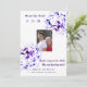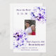 Design features couple's photo at centre surrounded by violet flowers. Above photo reads, "Save the Date!" followed by the date of wedding in numbers. Below photo is the customisable text displaying the same date a written out. A brief message from Bride and Groom appears below. At very bottom city and state of wedding is displayed. All text is in Old English font. Designed to coordinate with the "Elegant Violets Catholic Wedding Suite."