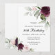 Celebrate a special 90th birthday milestone birthday with this beautiful party invitation with featuring floral borders in burgundy and pink roses on each side of the elegantly placed text. Colours include pale blush pink, deep burgundy red and plum mixed with ethereal greenery and tiny white accent flowers. Personalise the text template with your information. You can edit the age to any age birthday.