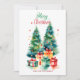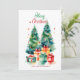 Elegant Watercolor Christmas Tree Holiday card featuring a festive watercolor Christmas tree adorned with glass ornaments and surrounded by wrapped presents. Personalise the card by adding a custom greeting and your family name. The Christmas tree holiday card reverses to your message displayed in dark lettering and a white background.
