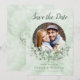 This elegant stylish photo save the date card features eucalyptus leaves framing the photo, with a dusty sage green watercolor texture background.