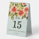 Elegant table number tent sign design featuring red watercolor roses, green foliage on a mint green background.
