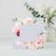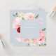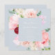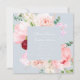 An elegant romantic wedding invitation features a watercolor floral bouquet in shades of blush and pink on a soft blue backgroun. Personalise with all the important details such as your names, wedding date, time and venue location.