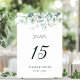 This wedding table number features painted watercolor eucalyptus, botanical green, and light blue leaves with modern calligraphy.