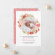 Elegant watercolor pink floral birth announcement template card featuring floral illustrations of coral pink roses, lavender, pomegranate fruits and green foliage on the front. The back reveals a coral pink polka dot background. On the front, a picture of your newborn that can be added on this card. Use a square size image for easy fit. The paper features round edges. Perfect card to announce the arrival of your new baby with his/her birth stats. Great for both baby boy and girl. Perfect for summer and spring seasons!