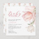 An elegant baby shower invitation features an arrangement watercolor tulips in shades of pink and white. Baby in Bloom in handwritten script.