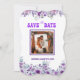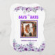 This beautifully designed "Save the Date" wedding announcement features a romantic couple embracing by the beach during sunset. Surrounded by elegant lavender and violet floral borders, the image is framed in a striking purple, enhancing the warmth and intimacy of the couple's moment. The announcement invites guests to mark their calendars for a wedding celebration on Saturday, August 8th, 20XX. A perfect blend of romance and style, ideal for beachside or floral-themed weddings.
