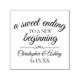 Wedding rubber stamp with an elegant divider, the couple's names and wedding date, and text, "A sweet ending to a new beginning."