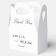 Delight your guests with this minimalist wedding favour box—perfect for holding sweet treats, small gifts, or thank-you notes. Designed to complement modern weddings, this favour box features a clean and elegant style with your choice of font colour (blue, brown, black, or gold) and a coordinating ribbon for a polished touch. Ideal for blue or brown wedding themes, this box adds a personal and memorable element to your celebration. Use it for receptions, bridal showers, engagement parties, or rehearsal dinners to add a refined and cohesive detail to your table décor.
