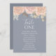 This design features an elegant reception floral table number sign, an elegant, simple, calligraphy script style with blue, floral, blush pink flower design a minimalist reception decor.