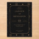 This is a sophisticated style image featuring an elegant wedding invitation for Lauren and Benjamin. The design showcases a rich black background adorned with intricate golden floral patterns, creating a luxurious and timeless feel. The text is presented in a classic serif font, adding to the formal and refined atmosphere of the occasion. It's perfect for setting the tone for a grand celebration filled with grace and elegance.