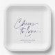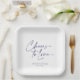Make your wedding celebration even more special with this elegant disposable paper plate featuring the phrase "Cheers to Love" in a stylish script font. The white background with dark blue lettering creates a timeless and sophisticated design. Personalised with the couple’s names and their special date, this plate is perfect for wedding receptions, engagement parties, bridal showers, and anniversary celebrations. A beautiful and practical touch for any love-filled event!