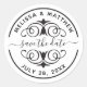 A custom round save the date sticker label embellished with a decorative scroll work emblem. Insert your names and date in place of the sample text shown in the design template. Designed for you by Blackberry Boulevard.