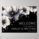 Cute and simple modern black and white wedding welcome sign design featuring a classic but whimsical look with black, grey, and cream-coloured flowers. Light grey fonts and modern lettering add a clean and sophisticated touch. Edit all of the text to your own information, and even change the background colour to anything you want. This versatile style works beautifully for a timeless and elegant wedding entrance display.
