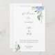 Chic and elegant blue hydrangea flat card wedding programs, featuring a beautiful floral design, a welcome message for guests, your names and date and editable program details at the back. The design is set against a white background, both back and front with text in grey. Space is available to add more wedding party names if required.