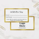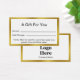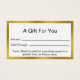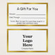 This white and faux gold gift certificate template has display text you can edit to create a custom business gift certificate. These white cards have a faux gold border. (The border is not made of foil.) There are lines for you to write the amount of the certificate and the date it's valid through. The other side has a display image you can replace with your logo and display text for the name of your business.