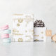 Chic white Christmas wrapping paper with large graphics of gold tone snowflakes, reindeer made of stars, and graphic text reading Merry Christmas. Very pretty paper for a larger gift idea like a shirt box or larger.