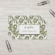 Elegant custom business cards with golden script and block letters inside a golden frame on a background pattern of vintage roses in white and golds, restored from an antique manuscript. Your name and title our business name go on the front, the back has room for your phone, email, website and address.