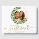This custom elegant wedding guest book with photo templates, golden yellow typography and an emerald green and gold foliage is easy to personalise with your pictures and text. The design features two photos - one on the front side and one on the backside. Please upload your photo and type your text before ordering.