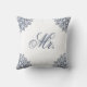 This elegant white and blue pillow with a script word Mr. is a part of matching products for making a set of two pillows for the newlyweds gift.