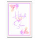 This is floral design in bright pink and violet hues on a white table card suitable for weddings or other parties. One side has the bride and groom names with artwork, while the reverse has the table number.