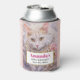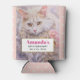 Can cooler with a lovely illustration. A long haired white cat looking regal and elegant. Surrounded by pink flowers, gold and diamond jewellery. Peach polka dot background.
