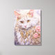 Canvas print with a lovely illustration. A long haired white cat looking regal and elegant. Surrounded by pink flowers, gold and diamond jewellery.