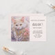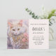 Birthday party invitation with a lovely illustration. A long haired white cat looking regal and elegant. Surrounded by pink flowers and diamonds.