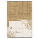 Elegant white corner lace on burlap wedding table number place card featuring white lace on linen natural burlap or hessian that covers two corners of a white rectangle with beige burlap border. Text in brown. Note that lace and burlap are all “printed on” and not real fabric. This elegant, shabby chic sophisticated and romantic design with a rustic essence is part of a wedding set and is perfect for a country chic or western spring, summer or fall/autumn wedding with a neutral colour palette.