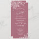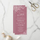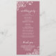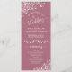 This beautiful wedding program features an elegant design with white text on a dusty rose or mauve pink coloured background and lacy white curls and swirls in the corners. The titles are written in fancy script calligraphy, and there is space for your ceremony and wedding party details, as well as a short thank you for your guests. Wonderful way to welcome your friends and family to your wedding celebration.