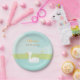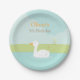 Birthday party paper plates with illustration of a white duck enjoying a peaceful swim at a pond. Background of clouds and flowers and green pasture which gives a wonderful feeling of spring. Personalise easily with your party message.