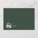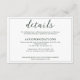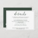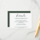 A Modern Wedding Details Enclosure card with a colour theme of white and emerald green / dark green. It features an elegant calligraphy script and formal serif font with the name of bride and groom at the back.