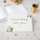 Collect messages from family and friends on your special day with this elegant guest book. Featuring delicate white flowers and greenery in a soft watercolor style, this design offers a timeless, botanical aesthetic perfect for garden, estate, or classic weddings. The stylish typography features a mix of classic serif and romantic script lettering, while the front cover is completed with a faux gold border. Customizable with your names and wedding date, the guest book is designed to look beautiful on your welcome table and serve as a cherished keepsake for years to come.