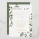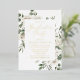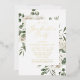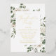 The elegant white floral graduation party invitation features the graduate's name and party details in gold foil lettering framed by painted watercolor eucalyptus leaves, lush green foliage, white and cream roses, and lisianthus flowers. The modern floral graduation invitations are perfect for both high school and college graduates.