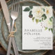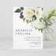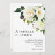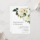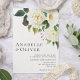An elegant floral wedding invitation features a watercolor arrangement of white florals with assorted greenery. Personalise all the important details including bride and groom name, wedding date and location. The reverse side is coordinated in black