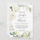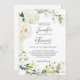 With a popular neutral colour scheme of white roses and hydrangeas with trailing eucalyptus and greenery, this unique wedding invitation has a QR code on the back of the all-in-one invitation to provide your wedding website information. Wedding guests can RSVP and view all the details surrounding your wedding events, schedule, hotel accommodations, reception info and more. The economical all-in-one invitation has all of your information contained on the invitation so as not to require an RSVP or enclosure card. The flowers on this popular design include soft watercolor roses, hydrangeas and matching mixed florals in an open wreath surrounding your text. The text pairings used in this layout feature the bride and groom's names prominently using a handwritten type face blended with an ever popular serif. Personalise the easy text template with your wedding details.