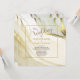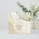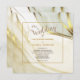 White faux marble is laced with shiny gold in the background of this elegant and modern wedding invitation. Your custom text is in matching gold and brown beneath the soft gold brown typography that says "the Wedding of". A thin gold square frame borders the wedding text. The back of the invitation has the same white marble and gold background.