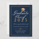Announce your college graduation in style with this elegant custom class of 2023 graduate announcement card. This formal typography design features the words Graduate Class of 20XX with your degree, name, school, and date to personalize in gold and white script accented by a faux gold graduate cap and framed in gold on a navy blue background. The back of the card is blue. Designed by Susan Coffey.