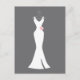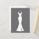 Postcard with a classy grey background. Designed with an elegant white gown hanging down from a hanger. Simple minimalist design.