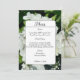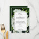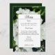 This is an elegant white flower floral wedding menu card with white hydrangea flowers photo with a forest green background. It is perfect for a summer or fall garden wedding celebration.