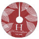 Elegant white leaf skeletons tree skirt with accenting festive red colour. Personalise your family's name, monogram, and established date.