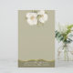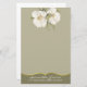 Elegant muted moss green stationery, with faint graphics of two white magnolia blooms decorating the top. A decorative gold tone border, at the bottom forms the footer, with custom white text ready to personalise. Lovely everyday stationery or for special occasions. Makes a nice gift too.