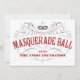 This elegant white Masquerade Invitation is two sided. The front is white with the words "You are cordially invited to a Masquerade Ball" in red and embellished with grey decorative ornaments and a Masquerade Mask. The back is red with a black border. Customise the front and the back with your party information.