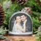 Elegant wedding snow globe keepsake gift for the newlywed couple feature a photo of the bride and groom with white text overlay. Custom wording includes "Mr. and Mrs." in modern calligraphy script with custom married last name and wedding date text in classic serif typestyles.